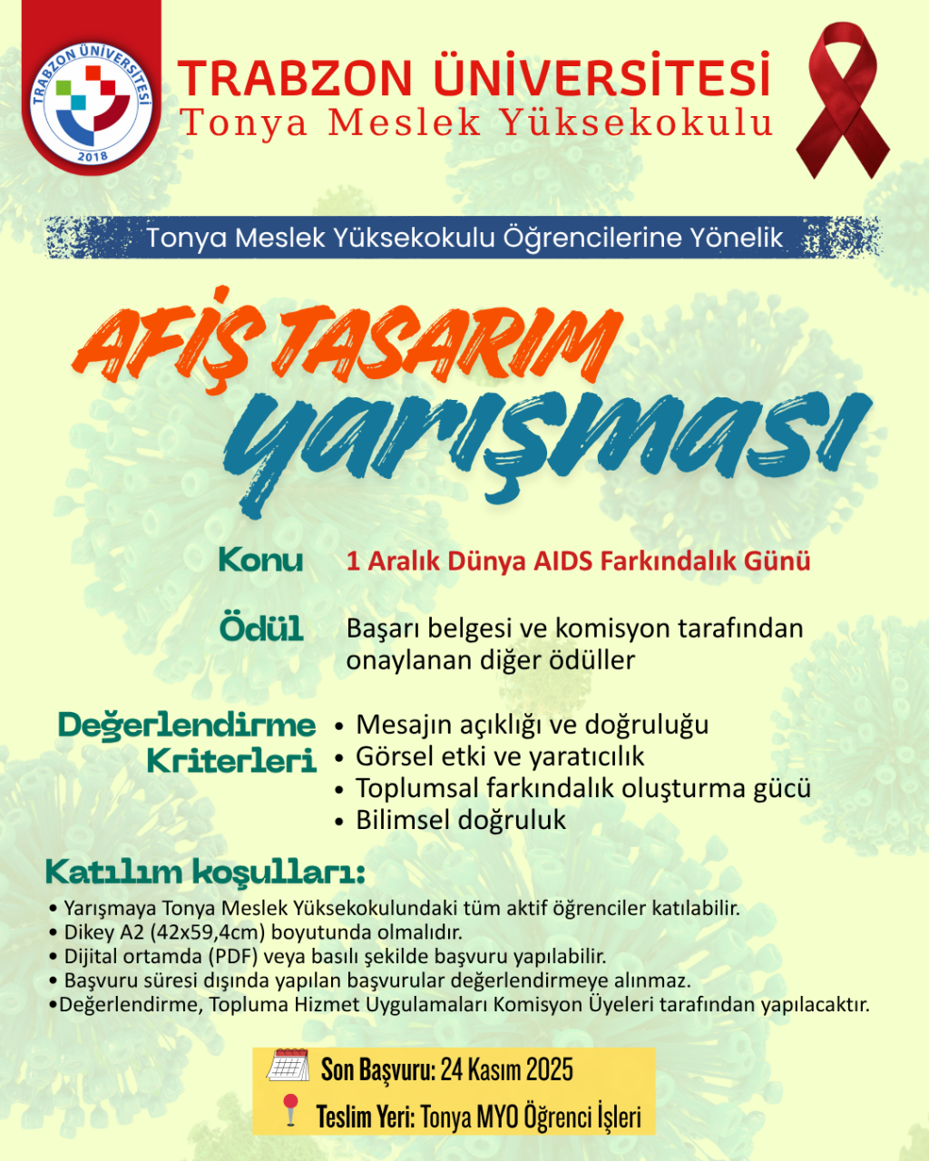 Tonya Meslek Yüksekokulu olarak öğrencilerimizde farkındalık oluşturmak ve topluma bilinç kazandırmak amacıyla “1 Aralık Dünya AIDS Farkındalık Günü” temalı bir Afiş Tasarım Yarışması düzenliyoruz. Bu yarışma ile toplumda AIDS konusunda farkındalık oluşturmak, bilgilendirici ve anlaşılır mesajlar içeren afiş çalışmalarını desteklemek hedeflenmektedir.