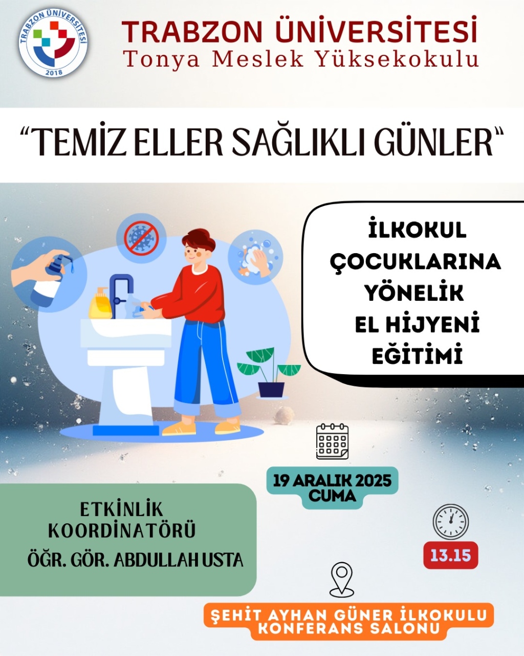 Yüksekokulumuz Sağlık Bakım Hizmetleri Bölümü Evde Hasta Bakımı Programı 1. sınıf öğrencileri tarafından ilkokul öğrencilerine yönelik "Temiz Eller Sağlıklı Günler" temalı el hijyeni eğitimi etkinliği gerçekleştirilecektir.