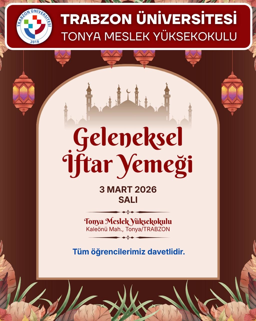 İftar Programımız, 3 Mart 2026 Salı günü Yüksekokulumuz yemekhanesinde gerçekleştirilecektir.