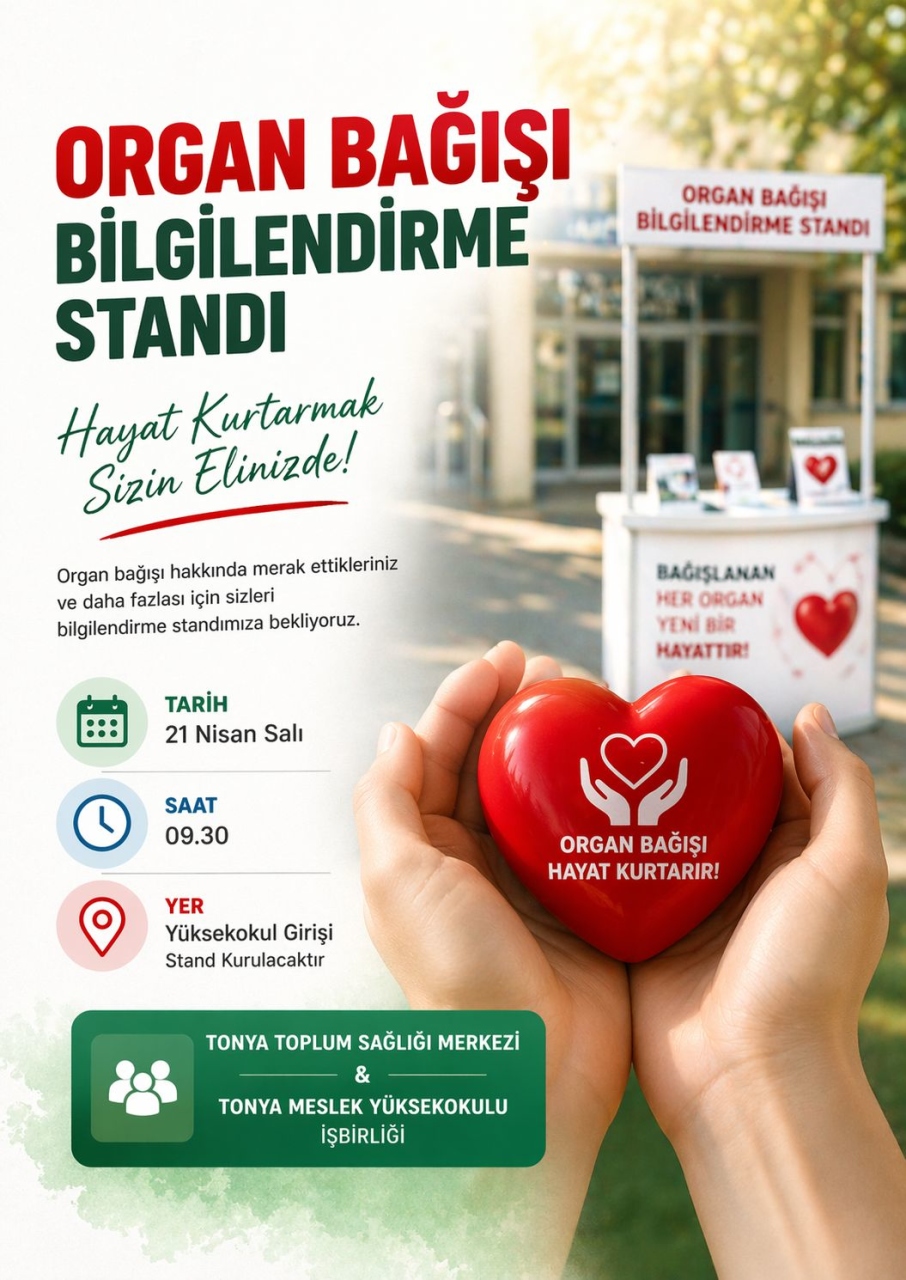 Organ bağışı konusunda farkındalık oluşturmak amacıyla kurulacak bilgilendirme standına tüm akademik ve idari personelimiz ile öğrencilerimiz davetlidir. Etkinliğe ilişkin detaylı bilgiler afişte yer almaktadır.